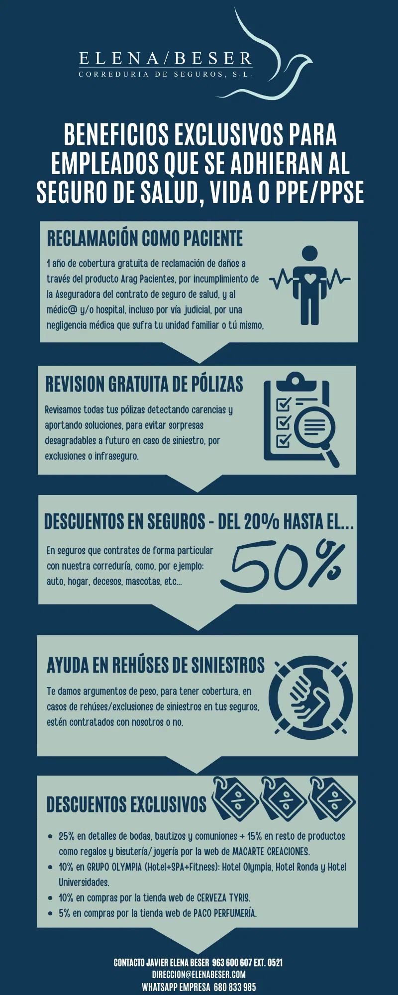 - Beneficios exclusivos de nuestra correduría a los empleados que se adhieran al seguro de salud, vida o PPE/PPSE. Puedes verlos en la siguiente infografía 👇🏻: